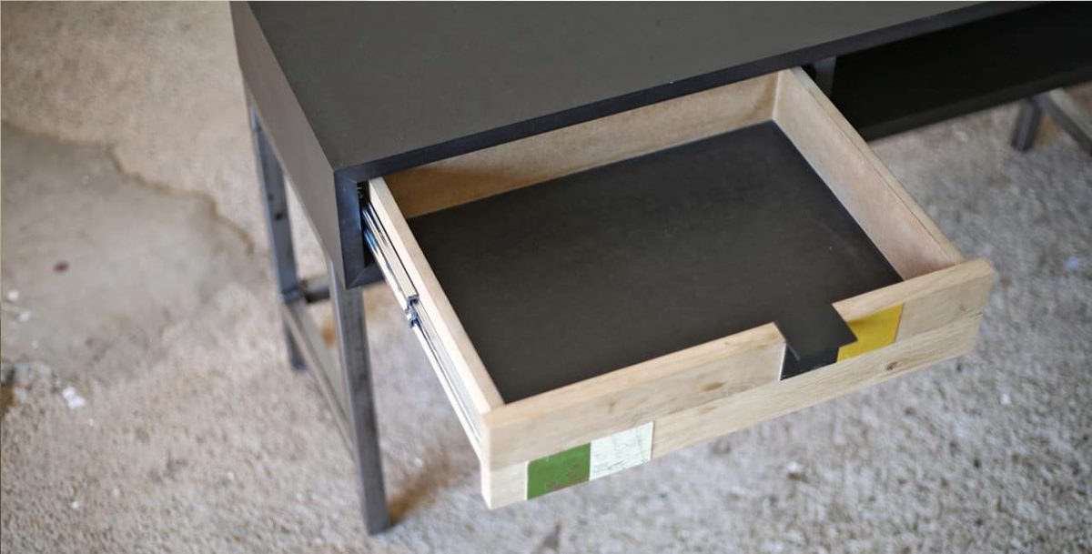 Sideboard aus Elementen einer alten Turnhalle, als Untergestell dient eine alte Umkleidebank, Schubladenfront aus Eichen-Turnhallenboden, Korpus aus schwarz eingefärbtem MDF, fein geschliffene Oberfläche, gewachst