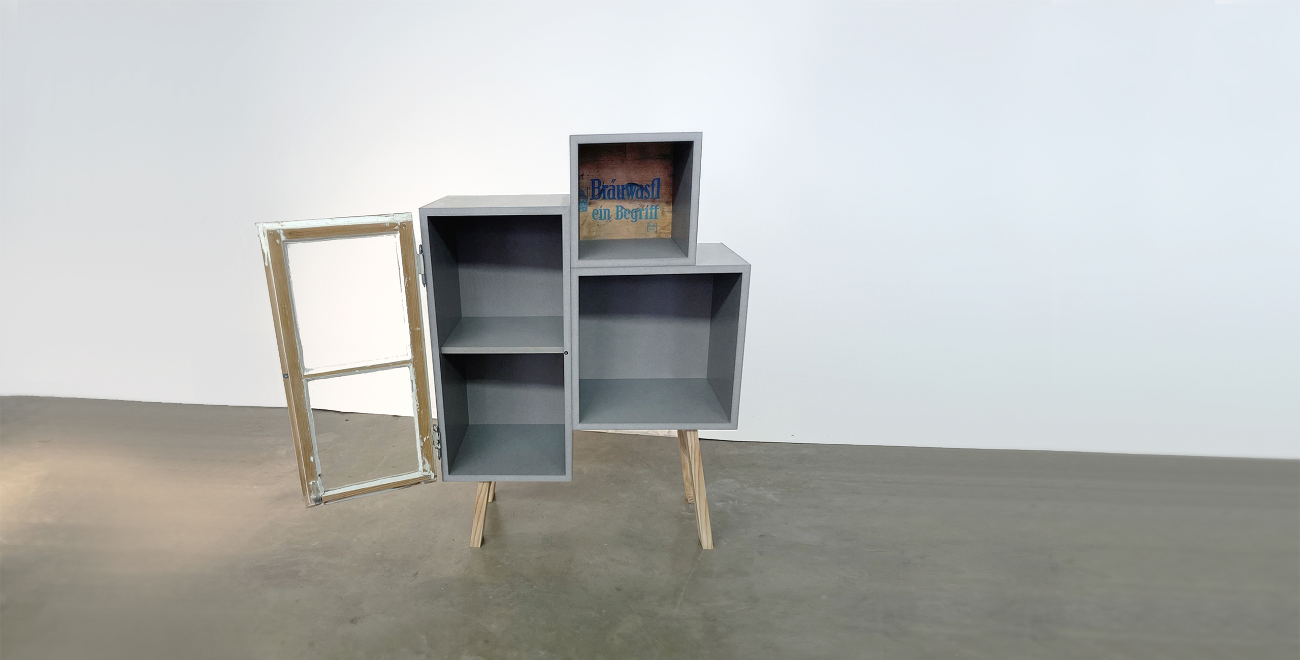 Sideboard aus grau eingefärbtem MDF mit Akzenten aus Altholz, Altbaufenster als Möbelfront, Rückwand aus einer alten Bierkiste aus Holz, schräg verlaufende Möbelfüße aus Fußbodendielen, 2 Möbelteile offen als Regal