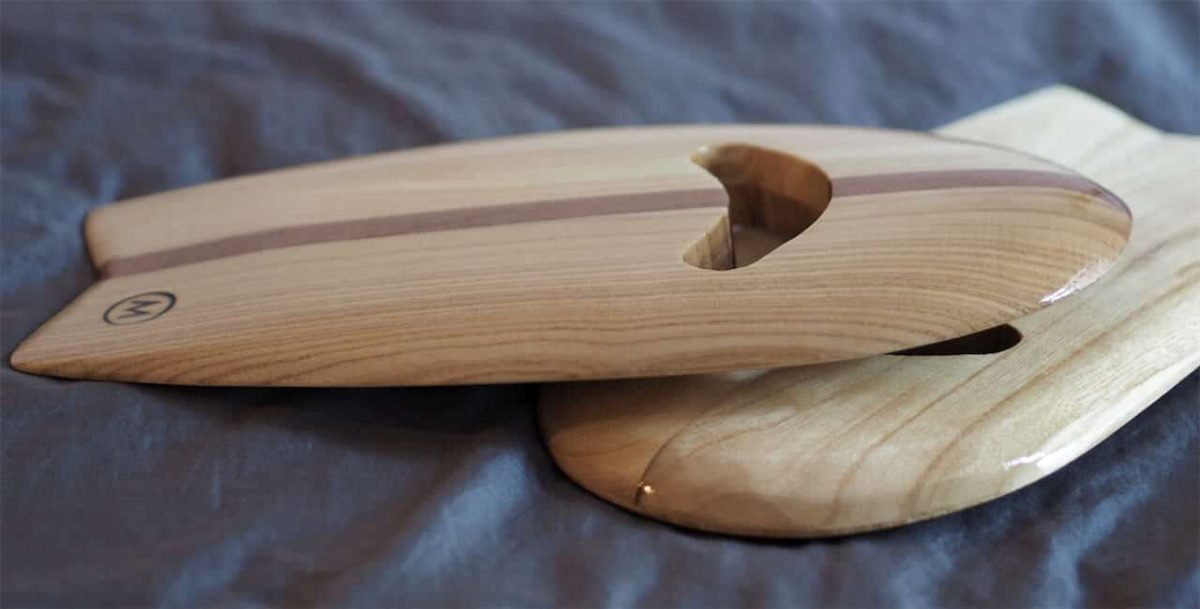 Handplane für Bodysurfing aus Altholzstreifen und Paulownia, klassiche Swallow-Tail-Form, handgeshapt, ausgefräste Griffmulde, Oberflächenbehandlung mit Bootslack oder Leinsamenöl