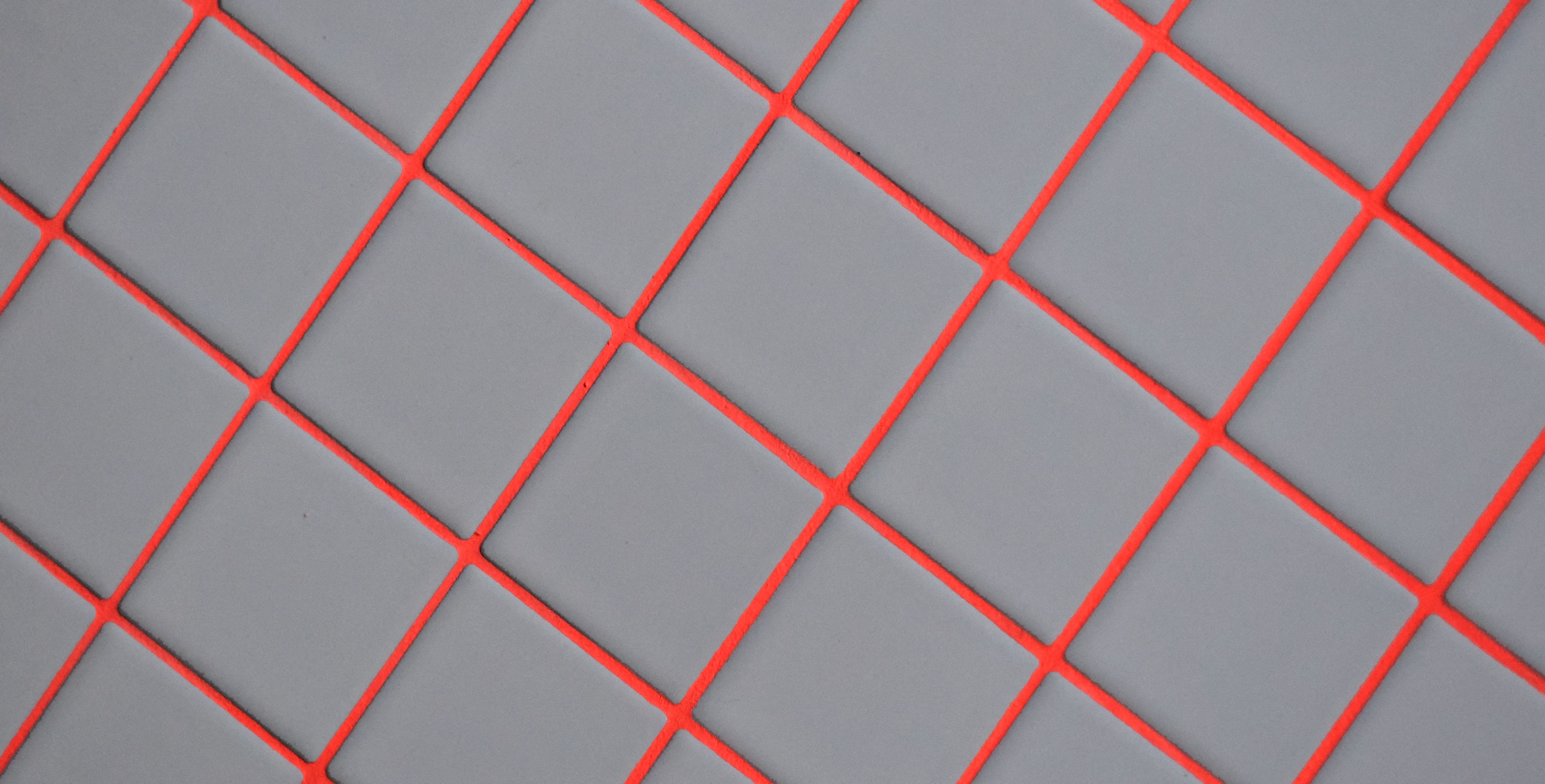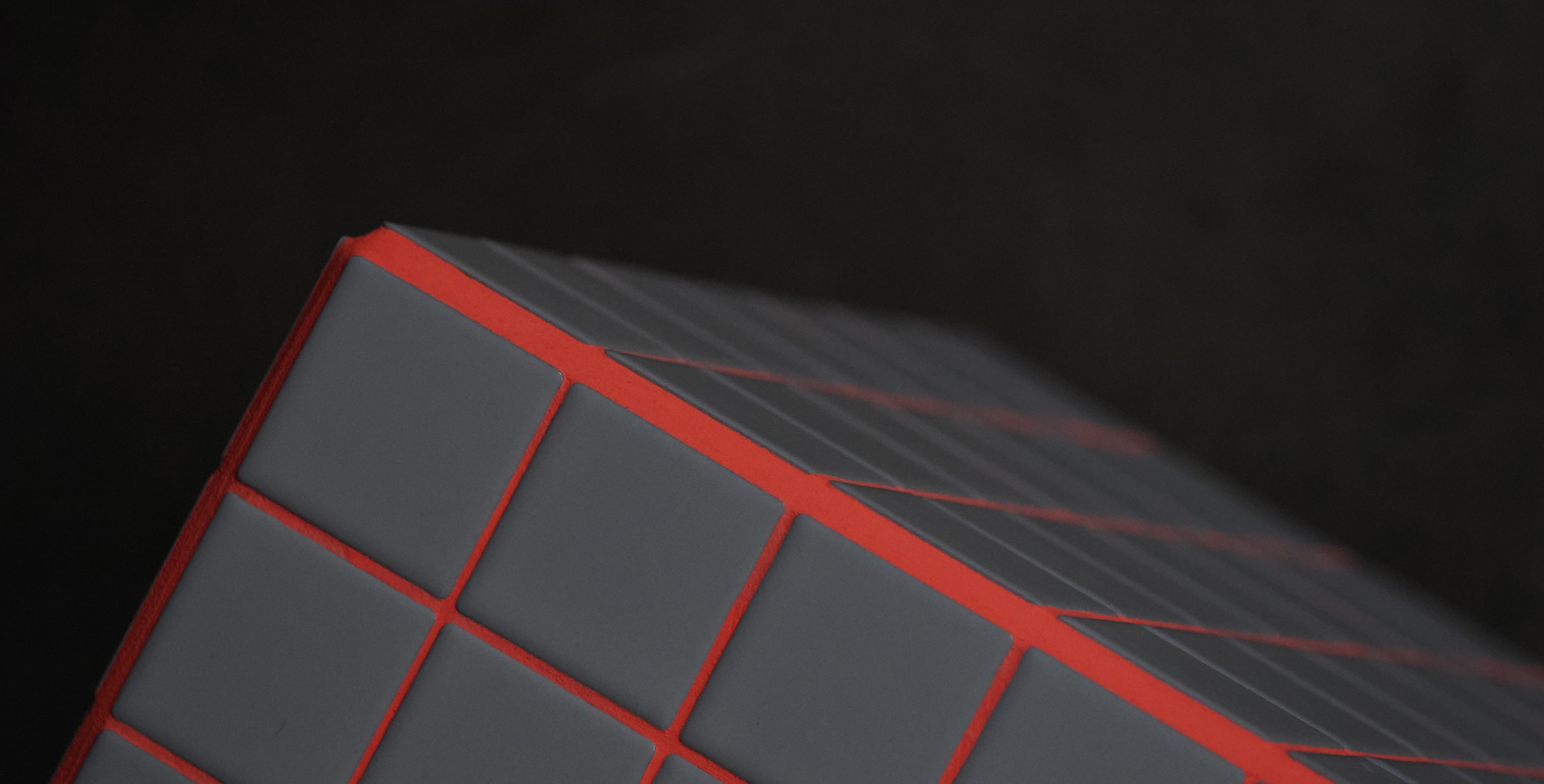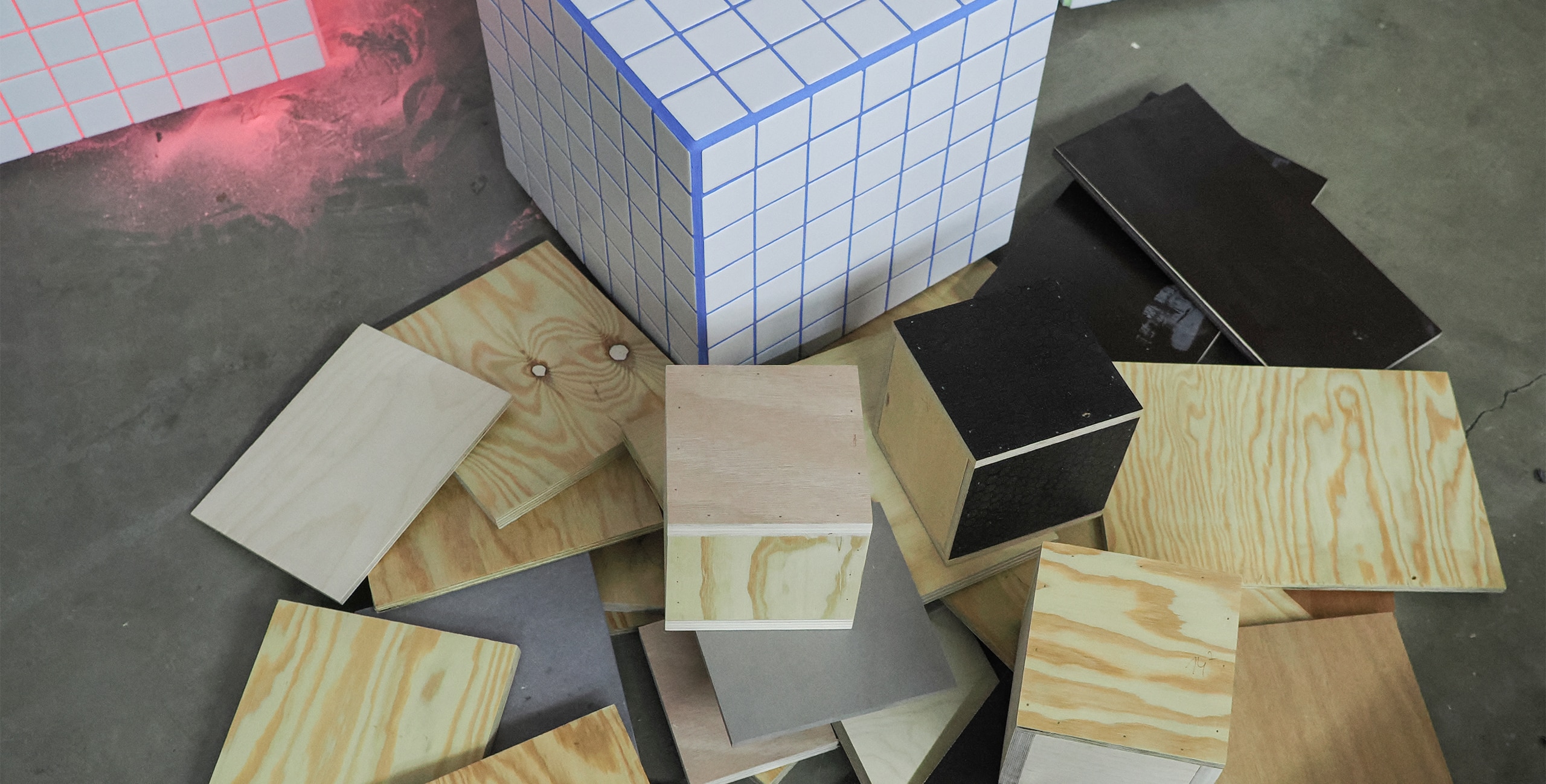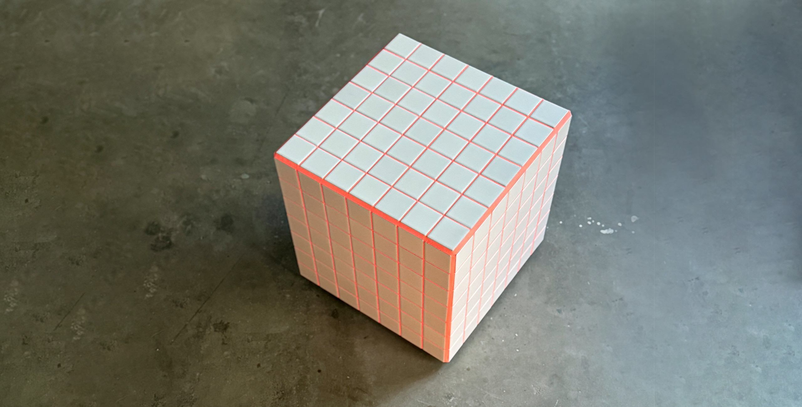 Fliesenkubus als Beistelltisch, innere Tragstruktur aus Altholz, belegt mit Steinzeugfliesen, pigmentierte Fugenmasse, verschiedene Farben